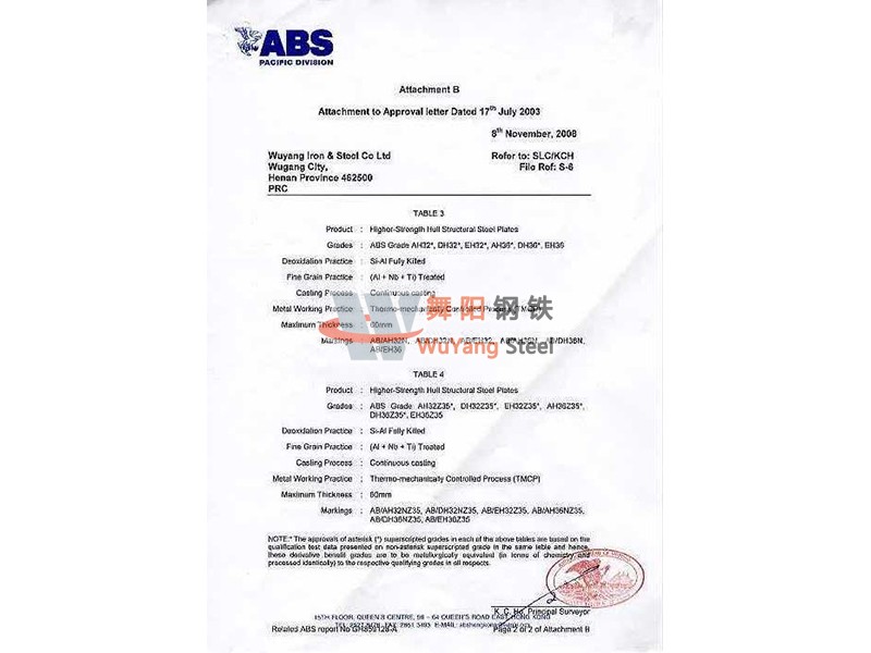 舞陽鋼鐵ABS(美國) 船舶船級社認(rèn)證證書